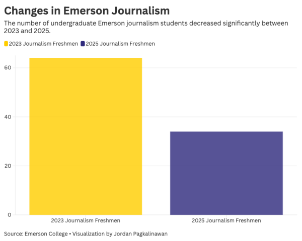 Emerson’s declining enrollment is reflected in the Journalism department. This year, one journalism professor reported having their Foundations of Journalism course, one of three required introductory journalism classes, cut due to enrollment decline specifically in the journalism program, as part of the larger trend. While there were 64 freshmen enrolled in the program in September 2023, this year there were only 34.