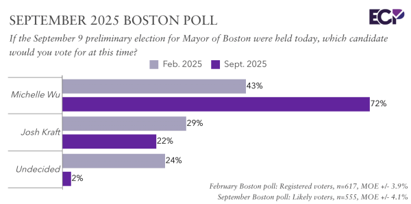 From the outset of the race, polls showed Wu handily ahead of Kraft. In February, an Emerson College Poll had Wu with 49% support, Kraft with 29%, and 24% undecided. In a follow-up poll published Friday, Wu jumped to 72% support, Kraft’s support slid to 22%, and only 2% of voters remained undecided.